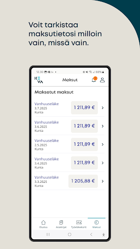 The user interface of the Kevan eläke ja kuntoutus app is designed with simplicity and functionality in mind. Based on the provided screenshots, the application features a clean layout with intuitive navigation. The main dashboard displays essential information at a glance, including payment statuses and notifications, ensuring that users can quickly access what they need without unnecessary clicks.